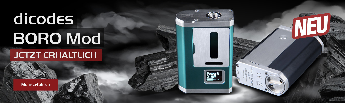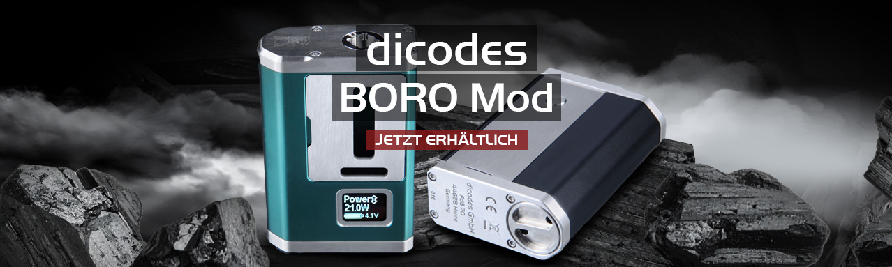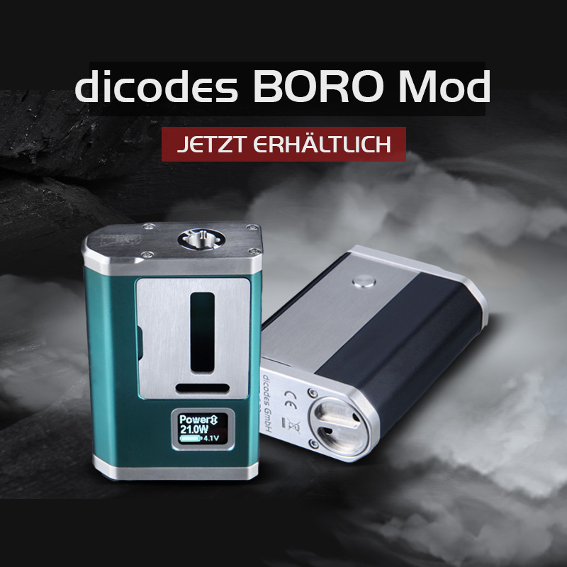 Der Dicodes Boro-Mod ist ein in Deutschland entwickelter Mod. Er ist kompatibel mit Standard-Boro-RBAs/-Tanks und bietet zwei unabhängige Feuertaster (seitlich und rückseitig). Ein gefederter Pluspol sorgt für zuverlässigen Kontakt zur RBA. Betriebsmodi Power (VW) TC-Modus (Temperaturkontrolle) Boost Heater-Protection Bypass (ungeregelt, elektronisch abgesichert) Features 0,66” OLED-Display 0,1-W-Schritte im MTL-Bereich (5 W bis < 20 W) für besonders feine Abstimmung Zwei wählbare Fire-Buttons (seitlich / rückseitig) Vielseitige Menüstruktur & individuelle Nutzer-Einstellungen Verpolungsschutz (Reverse Battery Protection) USB-C Ladeport mit LED-Indikator Made in Germany Farben: Black und Racing-Green Technische DatenAusgangsleistung: bis 60 Widerstandsbereich: 0,1 – 3,0 ΩDisplay: 0,66” OLEDStromversorgung: 18650-Li-Ion (ungeschützt)Laden: USB-C, LED-StatusanzeigeAbmessungen: 76,3 × 51,3 × 23,2 mmGewicht: 150 g (ohne Akku)Kontakt: gefederter Kontakt-Pin zur RBALieferumfang 1 × Dicodes Boro-Mod 1 × Verpackung (Aluminium-Dose) 1 × Dicodes-Wire Resistherm (NiFe30) Probe WichtigIm Falle eines Widerrufs behalten wir uns vor, einen Wertersatz geltend zu machen, sofern der zurückgesandte Dicodes Artikel Gebrauchsspuren (Macken oder Kratzer) und/oder einen Klick-Zähler (TotCyc) > 25 aufweist. Dieser Wertersatz wird im Einzelfall ermittelt und wird 10-25% des Kaufpreises betragen.